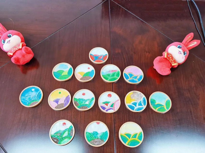 課上,單文靜詳細(xì)介紹了掐絲琺瑯彩畫的歷史淵源、發(fā)展歷程和工藝流程,并現(xiàn)場教授創(chuàng)作技巧和色彩搭配,培養(yǎng)大家對琺瑯彩畫藝術(shù)的審美情趣。在場人員聚精會(huì)神地傾聽、觀看,相互討論交流。隨后,在老師的指導(dǎo)下,大家用自己的巧手和智慧,按照“掐絲-洗沙-點(diǎn)彩”的步驟,制作出了一個(gè)個(gè)極具個(gè)性、各具韻味的掐絲琺瑯畫杯墊。