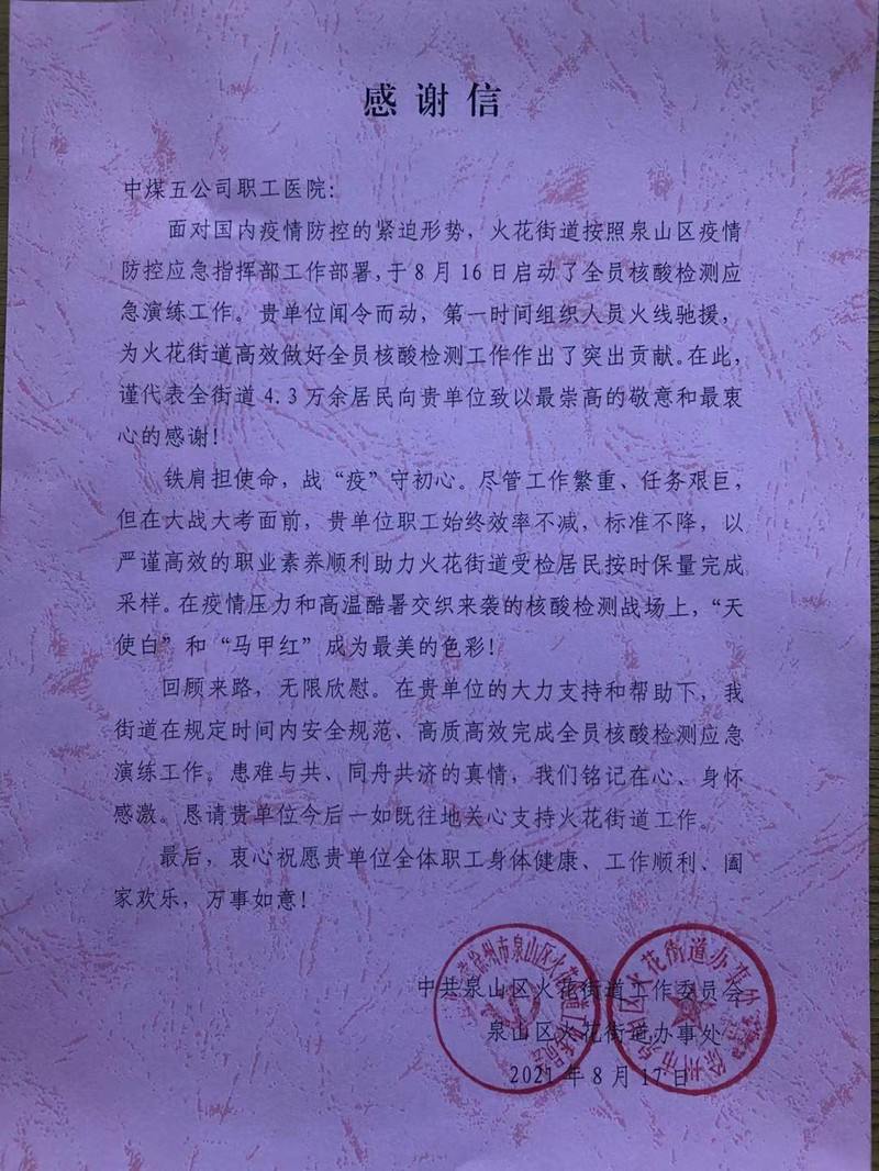 8月19日上午,泉山區(qū)火花辦事處領(lǐng)導(dǎo)一行來(lái)到中煤五公司職工醫(yī)院,并送上感謝信和錦旗,表示“在中煤五公司職工醫(yī)院的大力支持和幫助下,街道在規(guī)定時(shí)間內(nèi)安全規(guī)范、高質(zhì)高效完成全員核酸檢測(cè)應(yīng)急演練工作。患難與共、同舟共濟(jì)得 真情我們銘記在心、身懷感激”。院黨委書(shū)記宋俊祥代表全院參戰(zhàn)職工接受感謝信和錦旗,并表示今后將一如既往支持街道辦事處工作,共同戰(zhàn)役、共擔(dān)使命。