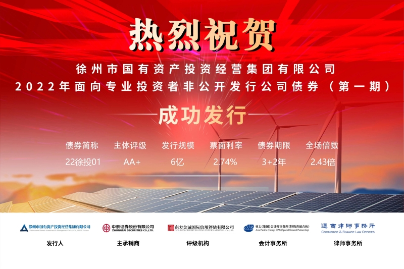 九、11月9日,徐州國投集團(tuán)2022年面向?qū)I(yè)投資者非公開發(fā)行公司債券(第一期)成功發(fā)行,募集資金規(guī)模6億元,期限為5(3+2)年,票面利率為2.74%。作為徐州國投集團(tuán)在資本市場(chǎng)上首次發(fā)行的債券,此次發(fā)行進(jìn)一步拓寬了公司的融資渠道,優(yōu)化了負(fù)債結(jié)構(gòu),降低了融資成本,邁出了從傳統(tǒng)融資方式向市場(chǎng)化融資方式轉(zhuǎn)變的關(guān)鍵一步,為后續(xù)在資本市場(chǎng)運(yùn)用其他融資工具奠定了良好基礎(chǔ)。